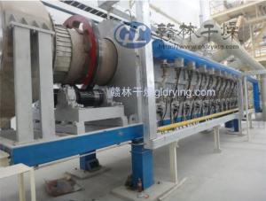 先通過天然氣燃燒器在燃燒室燃燒,將旋轉的回轉滾筒筒體加熱均勻。物料通過定量加料器將物料送入回轉滾筒內部,通過筒體的旋轉和筒體的傾斜度,使物料不斷地向前移動。在移動的過程中,加熱后的筒體將熱量傳遞給物料,使物料溫度上升,產品得到煅燒,煅燒后的產品成高溫狀態從尾端排出。