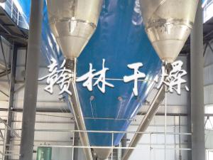 自然空氣通過風機強制進入空氣加熱器內(電加熱,蒸汽加熱器,導熱油加熱器,燃天然氣(油,煤)熱風爐,將空氣加熱到所需的干燥溫度。加熱后的空氣通過管道送入干燥塔頂垂直式熱風分布器,直線吹下。槳液經過壓力泵增壓后通過壓力式噴槍高速噴出,形成細霧狀,噴槍安裝在干燥塔筒體中部向上,霧粒在中部向上形成噴泉狀,在筒體內形成垂直向下的熱風和向上的霧狀料液接觸,從而實現將料液進行干燥,干燥后的料液成固體粉狀產品混合在熱空氣內,在下落過程中重新和液狀霧粒粘合,形成霧狀長大。在干燥塔底部通過重力沉降,將粉狀產品和廢熱空氣大部分分離,粉狀產品自干燥塔底部排出,少部分產品被廢熱空氣一起帶入旋風除塵器(或布袋除塵器)進行二次氣固分離。將產品收集下來包裝。廢熱空氣由引風機排出.